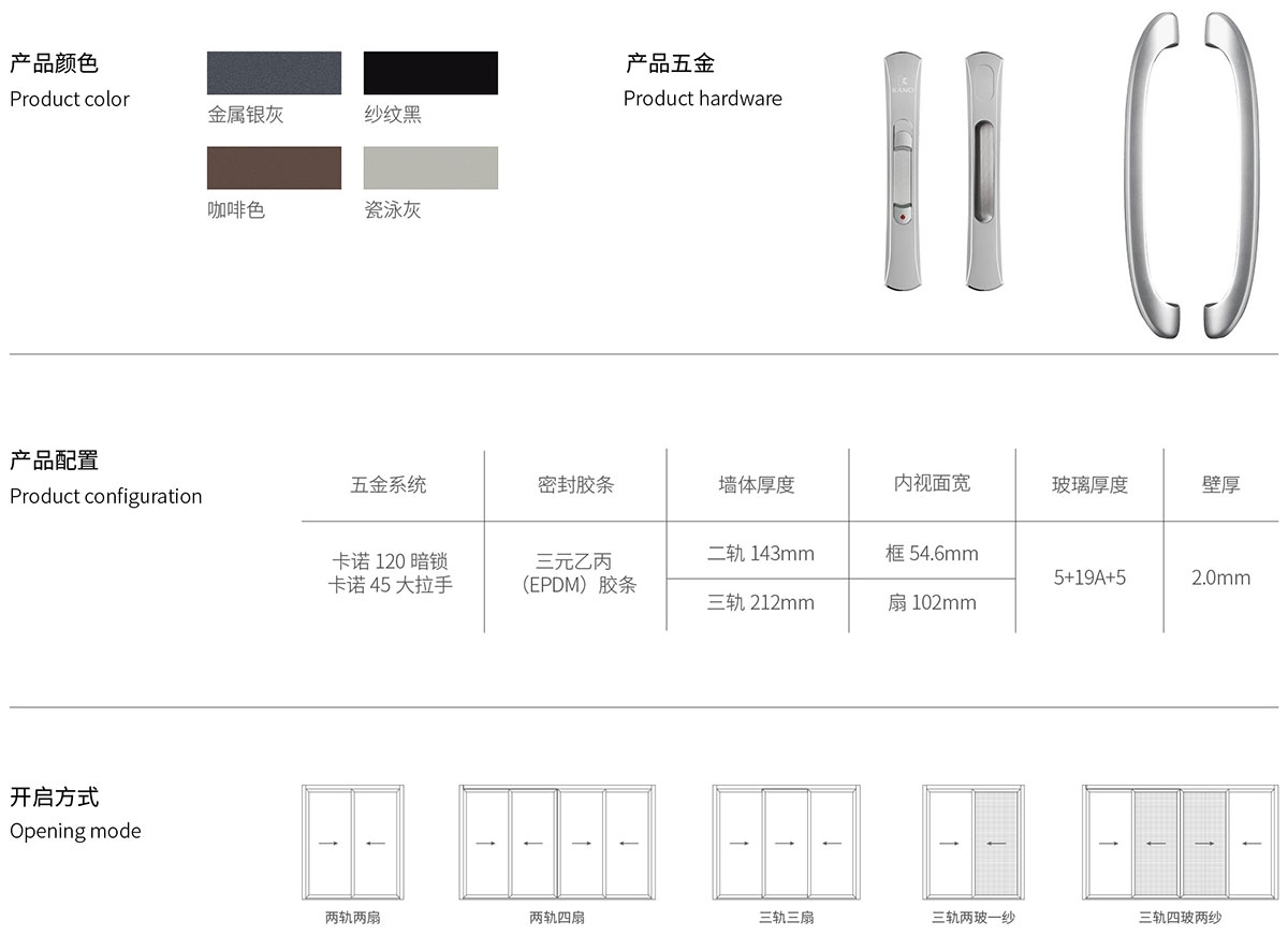 • 采用國家標(biāo)準(zhǔn)高精級鋁型材及卡諾專展定制五金配件 ,豪華大氣 ,內(nèi)置多鎖點(diǎn)的結(jié)構(gòu)設(shè)計(jì) ,令防盜、安全性能更為優(yōu)越。